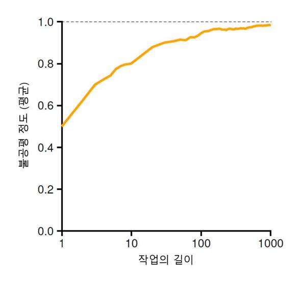- 작업의 길이가 100이고 100장의 같은 추첨권을 가진 두 작업 (