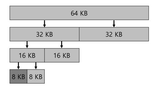이 예에서 가장 왼쪽의 8 KB 블럭이 할당되고 (짙은 회색으로 표시) 사용자에게 반환된다. 이 방식은 2의 거듭제곱 크기 만큼의 블럭만 할당할 수 있기 때문에 내부 단편화로 고생할 수 있다는 점에 유의하라.