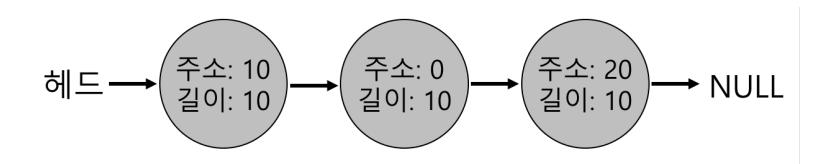 위에서 언급한 전략이 동작하는 몇 가지 예를 보도록 하겠다. 크기가 각각 10, 30, 및 20인 세 개의 원소를 가진 빈 공간 리스트를 생각해 보자(여기서는 헤더와 다른 세부 사항은 무시하고 전략이 동작하는 방법에 대해서만 초점을 맞춘다).