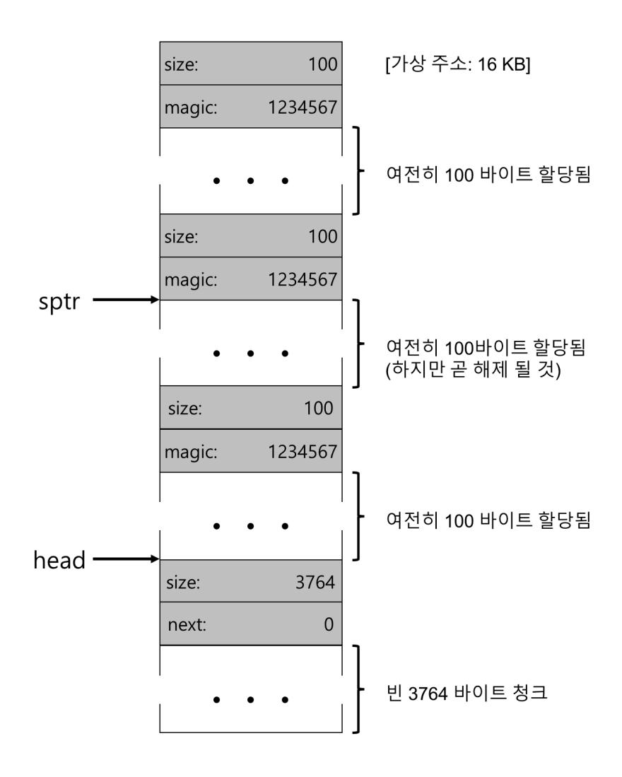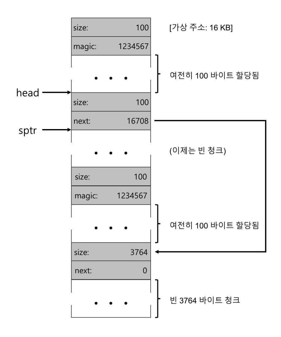 헤더를 가리키는 포인터를 얻어 내면, 라이브러리는 매직 넘버가 기대하는 값과 일치하는지 비교하여 건전성 검사(sanity check)를 실시한다(assert(hptr->magic == 1234567)). 그리고 새로 해제된 영역의 크기를 간단한 수학을 통해 계산한다(즉, 헤더의 크기를 영역의 크기에 더함). 주의할 점이 있다. 빈 영역의 크기는 헤더 크기 더하기 사용자에게 할당된 영역의 크기가 된다. 사용자가 바이트의 메모리 청크를 요청하면 라이브러리는 크기 의 빈 청크를 찾는 것이 아니라 빈 청크의 크기 더하기 헤더의 크기인 청크를 탐색한다.