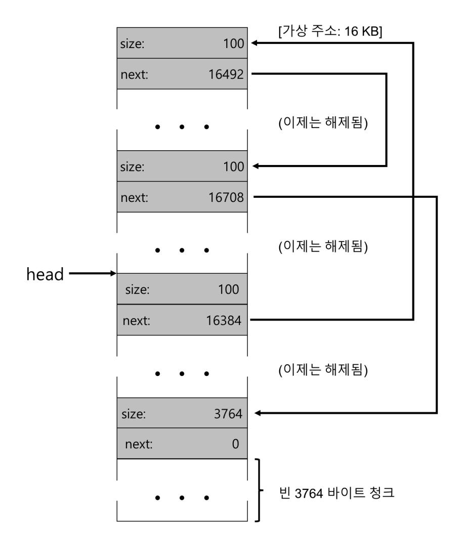 그림에서 볼 수 있듯이 힙의 시작 부분 324바이트가 현재 할당되어 있다. 3개의 헤더와 호출 프로그램에 의해 사용 중인 3개의 100바이트 영역을 볼 수 있다. 빈 공간 리스트는 여전히 head가 가리키는 하나의 노드로 구성되어 있지만 세 번의 분할 이후 3764바이트로 축소된 모습이다. 프로그램이 free()를 통해 일부 메모리를 반환하면 어떤 일이 벌어질까?