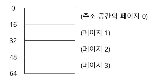 이 방법을 명확히 이해하기 위해 간단한 예를 통해 설명해 보자. 그림 18.1은 총 크기가 64바이트이면서 4개의 16바이트 페이지로 구성된 (가상 페이지 0, 1, 2, 3) 작은 주소 공간의 예를 보여준다. 물론 실제 주소 공간은 훨씬 커서 32비트의 경우 4GB, 64비트의 경우에는 그보다 훨씬 크다1.