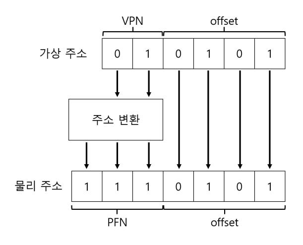 프로세스가 생성한 가상 주소의 변환을 위해 먼저 가상 주소를 가상 페이지 번호(virtual page number, VPN)와 페이지 내의 오프셋 2개의 구성 요소로 분할한다. 이 예에서는 가상 주소 공간의 크기가 64바이트이기 때문에 가상 주소는 6비트가 필요하다 (). 가상 주소를 개념적으로 다음 그림과 같이 생각할 수 있다.