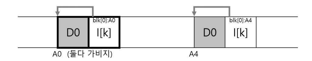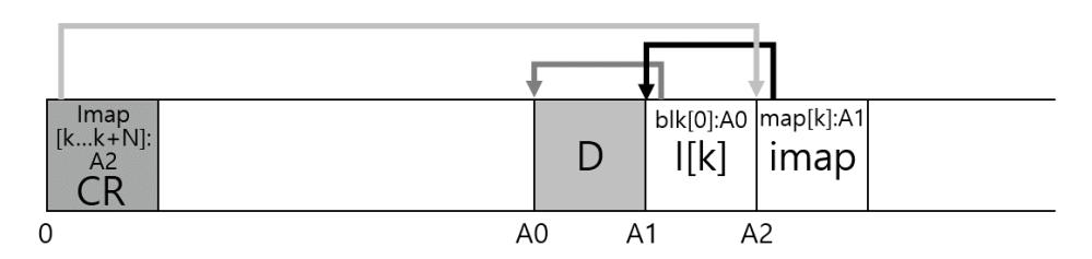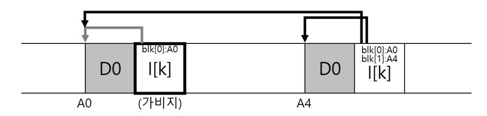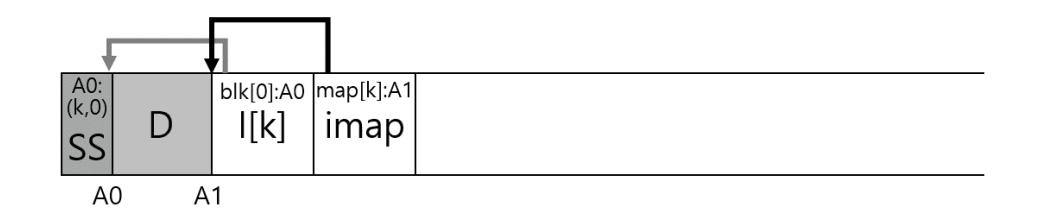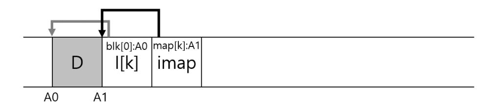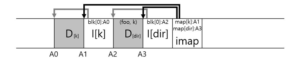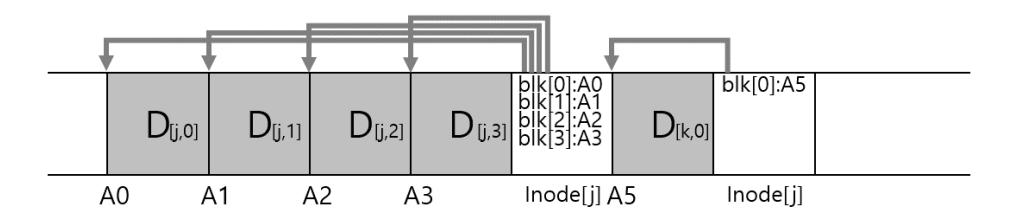 blk[0]:A0는 첫 번째 블럭의 주소가 A0라는 뜻이다. I[k]는 k 번째 아이노드를 나타낸다. map[k]:A1은 k 번째 아이노드가 A1에 위치해 있다는 뜻이다. 이 그림에서는 imap이라고 표기된 블럭에 저장되어 있는 아이맵의 일부가 아이노드 는 디스크 주소 A1에 있다고 나타내고 있다. 이 아이노드는 데이터 블럭 D가 주소 A0에서 시작한다는 정보를 갖고 있다.